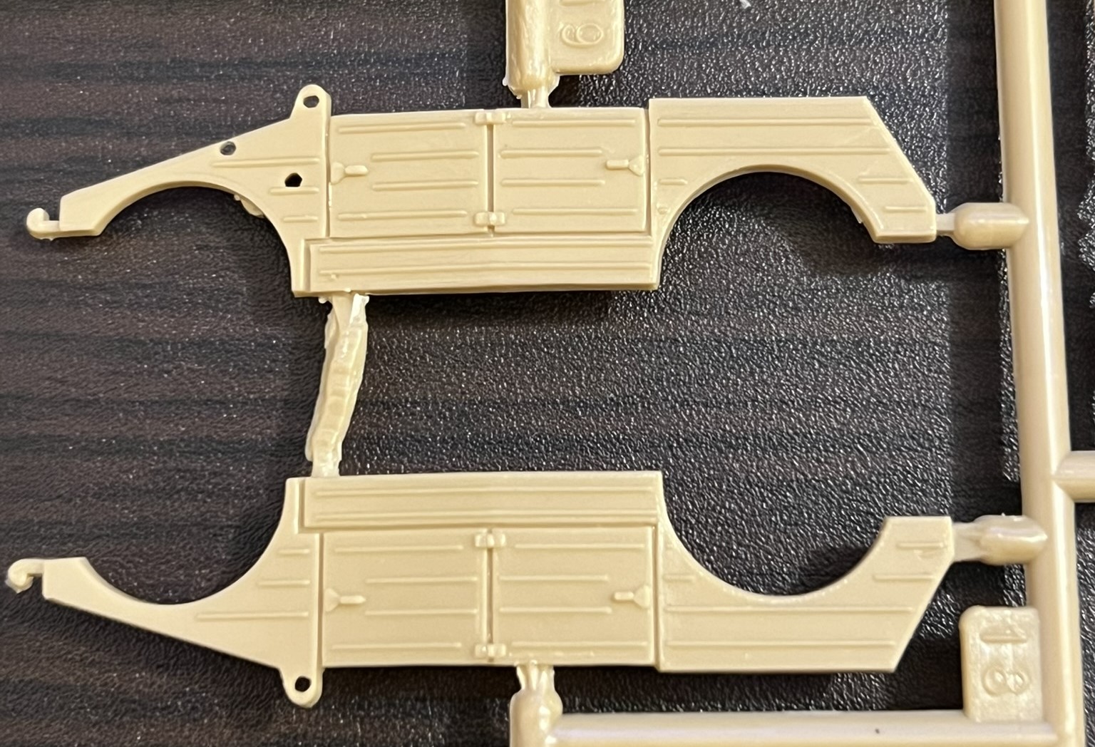 4. 家の在庫を調べてみたら日東のキューベルワーゲンがありました。比較してみるとドアヒンジやリブのモールドパターンが違うのでこれではないようです。